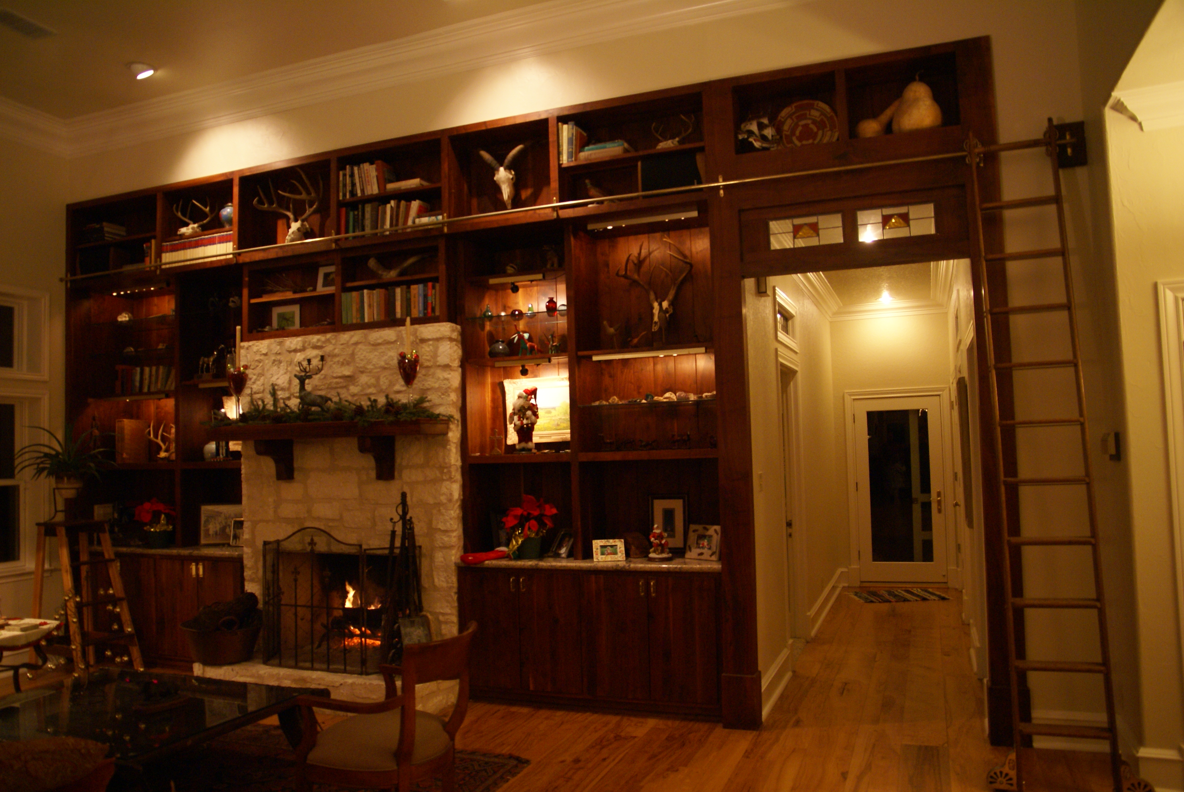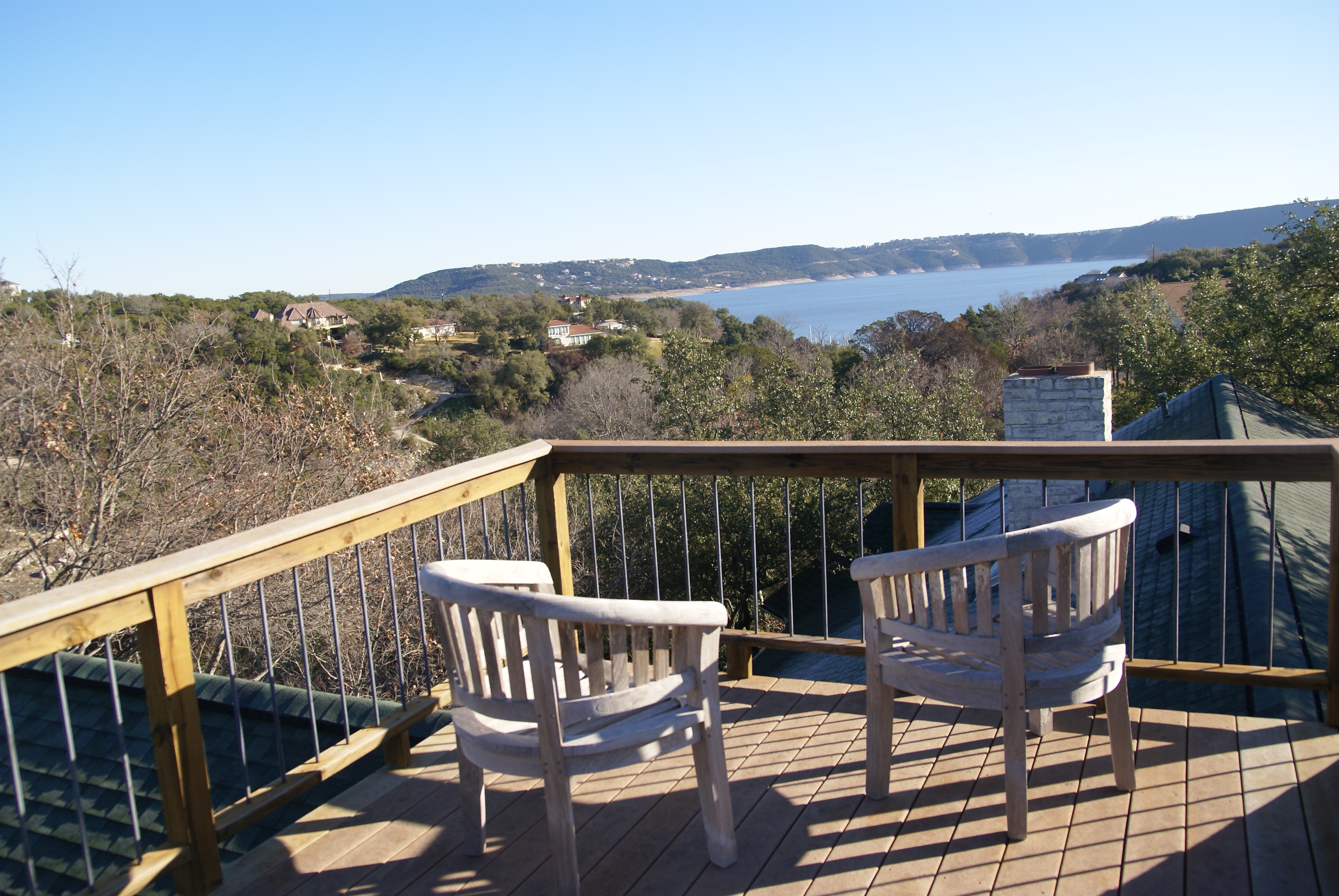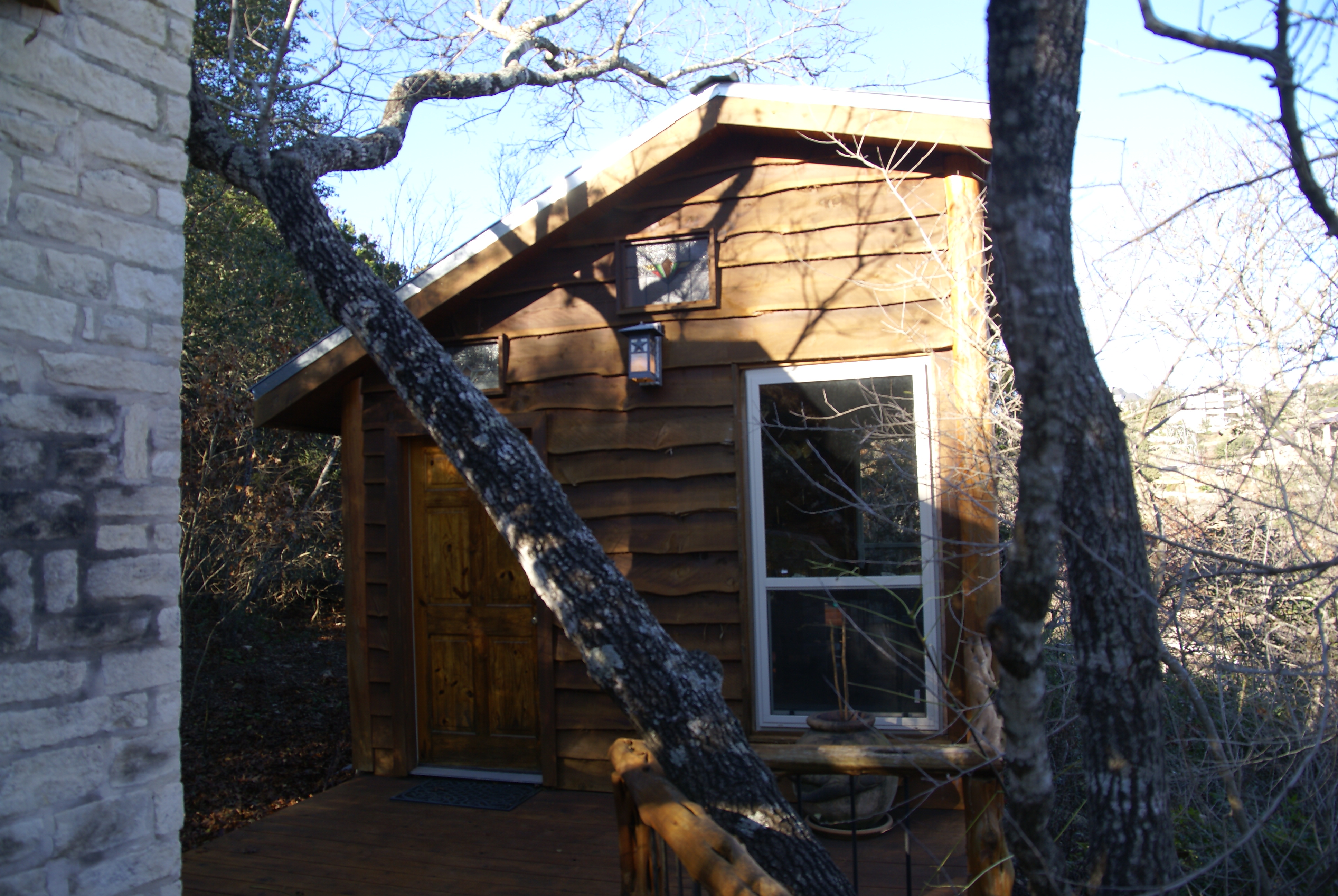 Their house is a work of art. They lived in a trailer while they were building it. They made the floors and the shelves from trees they bought themselves and they have integrated old stained glass pieces here and there. A long staircase leads up to the roof and there is a patio up there with a view of the lake. There is a dome over the kitchen made of bricks brought from Mexico. There are lamps made out of rocks that give off an orange glow.