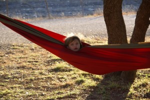 We finally got the hammock up. It took a long time to find spare time plus two strong trees the right distance apart. Morgane found it very amusing.