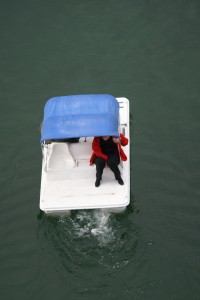 They made it around the corner past the lighthouse and then began to run into some light traffic including the very large paddle-wheeler that ferries visitors to the casino across the lake. They got to ride a few waves as they crossed into the right lane.