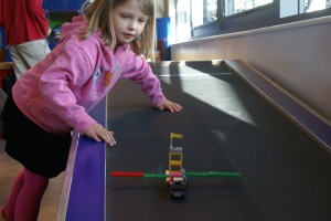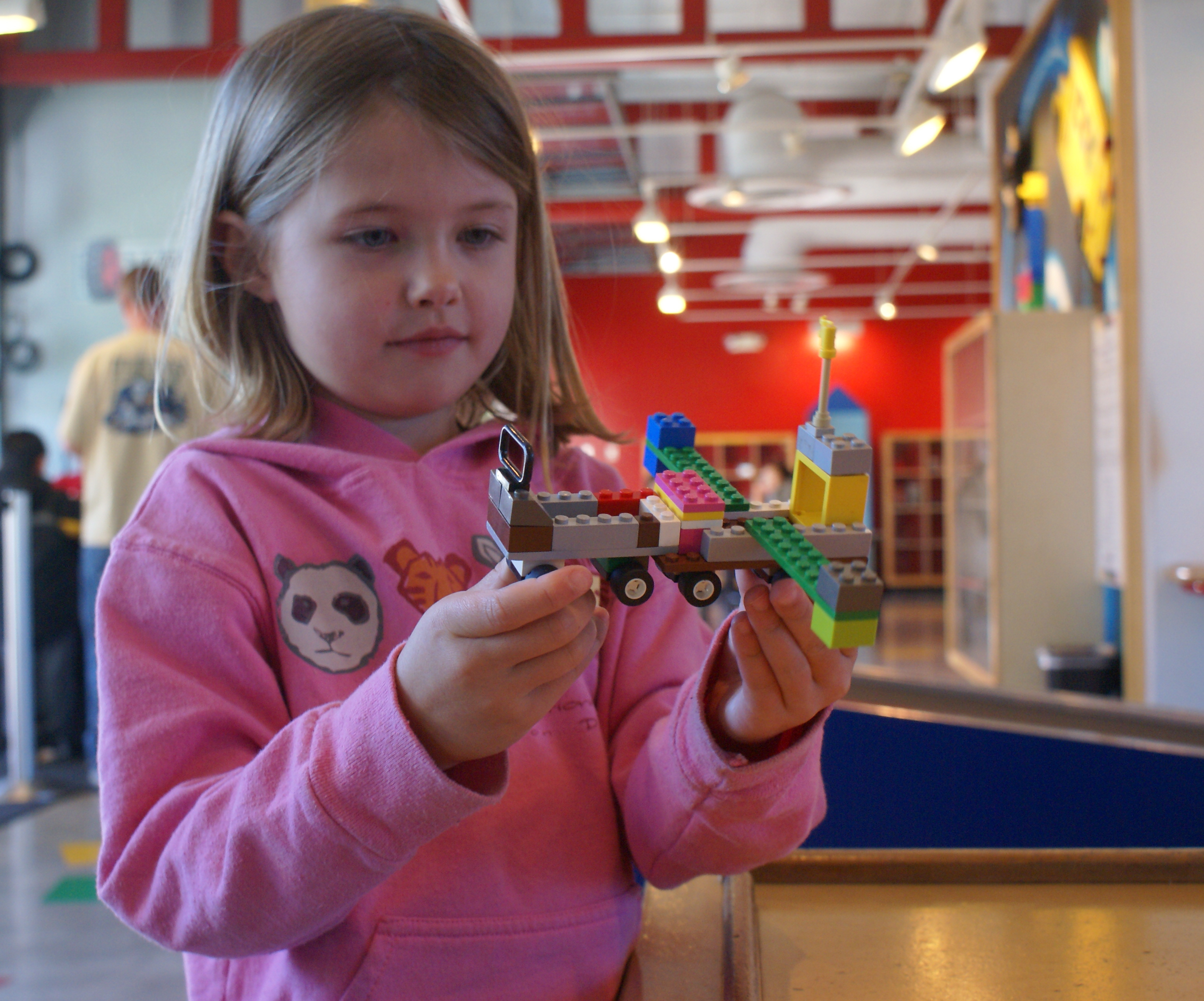 Morgane liked digging up bones like a paleontologist and she really liked designing and building her own lego vehicle and then testing it out on a ramp (and racing against others). Once she had a vehicle she was happy with, she didn’t want to take it apart so she convinced the staff member to put it on his special shelf for awhile.