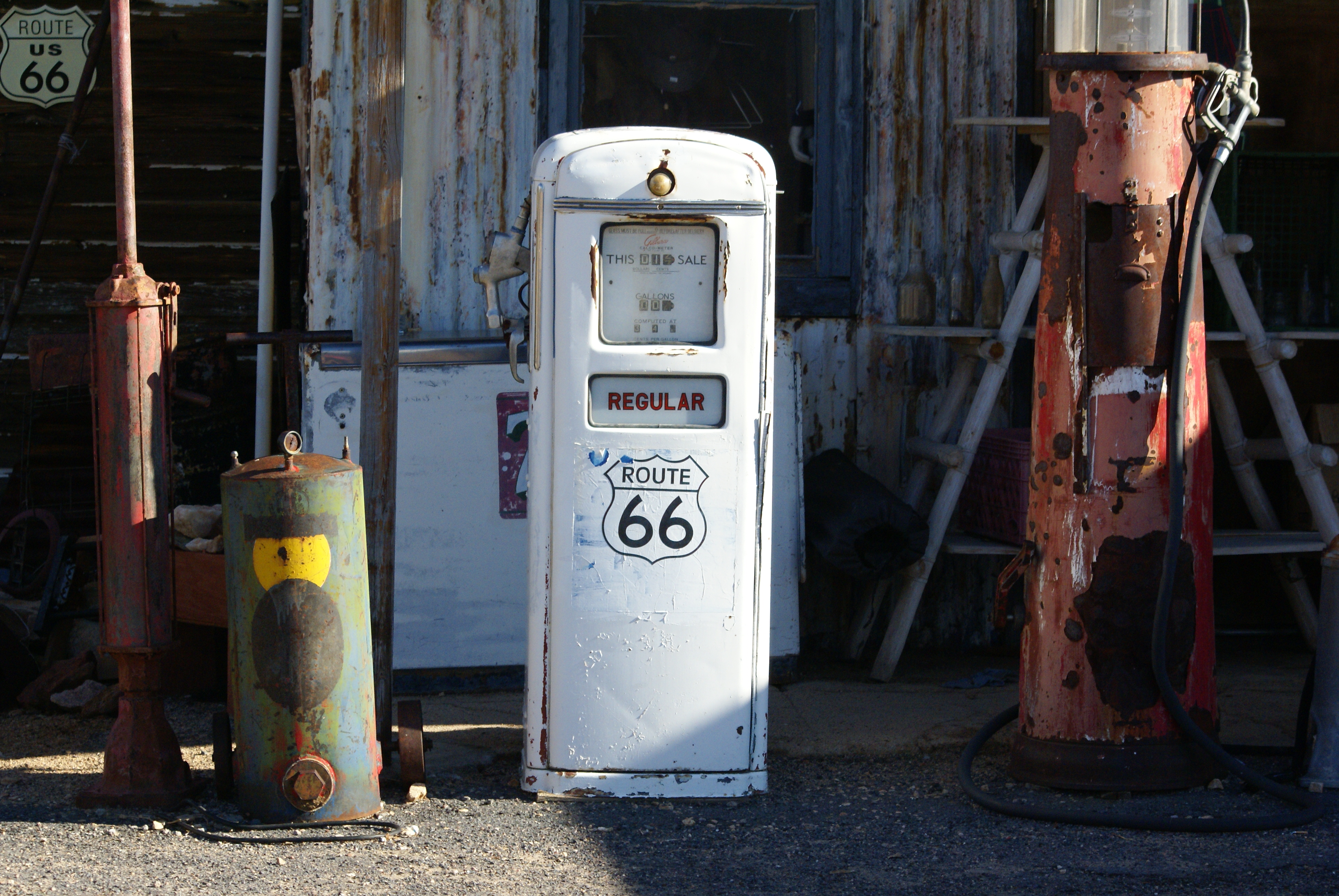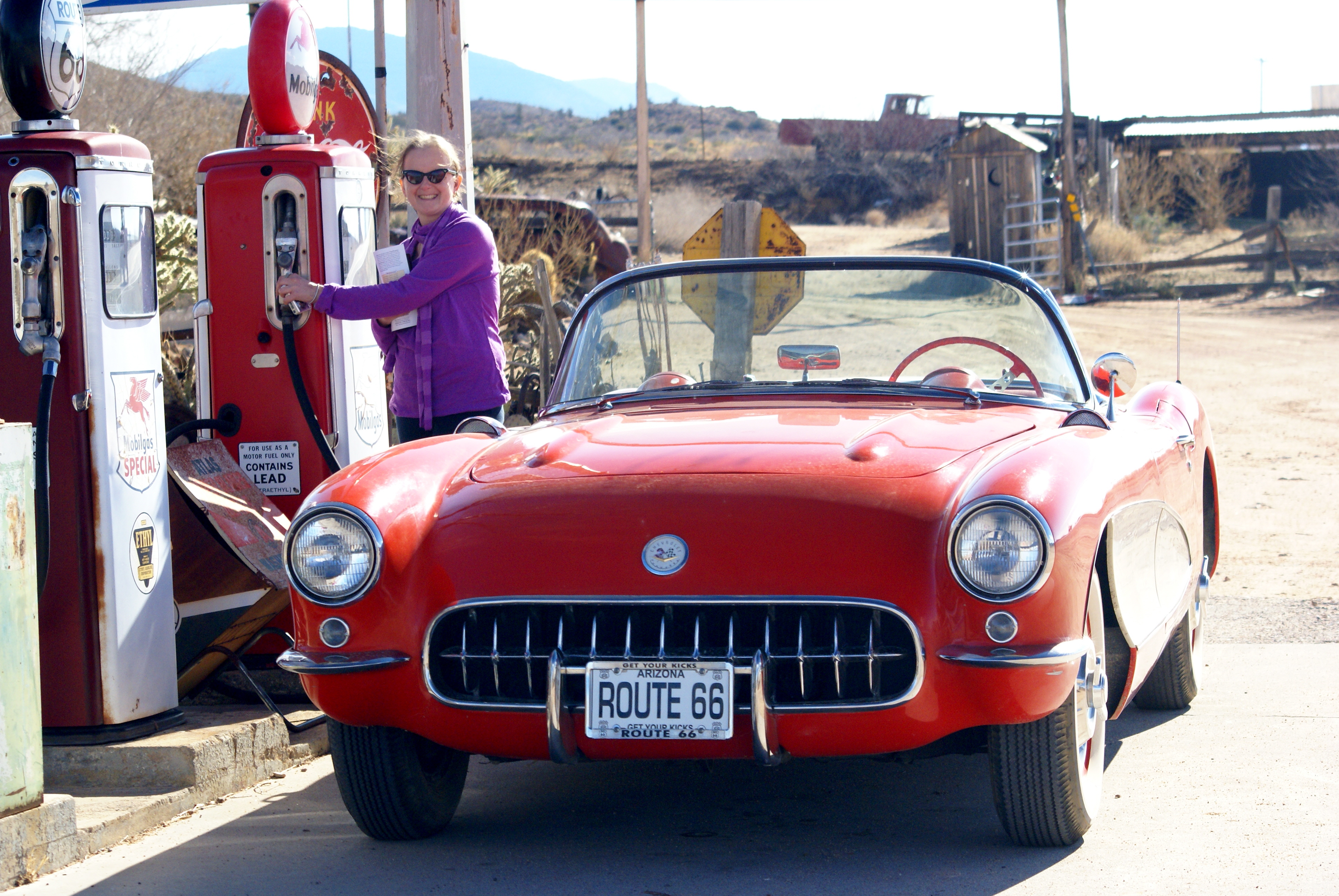 The first place we stopped, there was a fake gas station with a vintage car parked in front of it. Inside were booths set up to look like in the sixties. You could buy lots of things including a copy of Elvis’ driving license. I bought a Route 66 Beer (root beer).