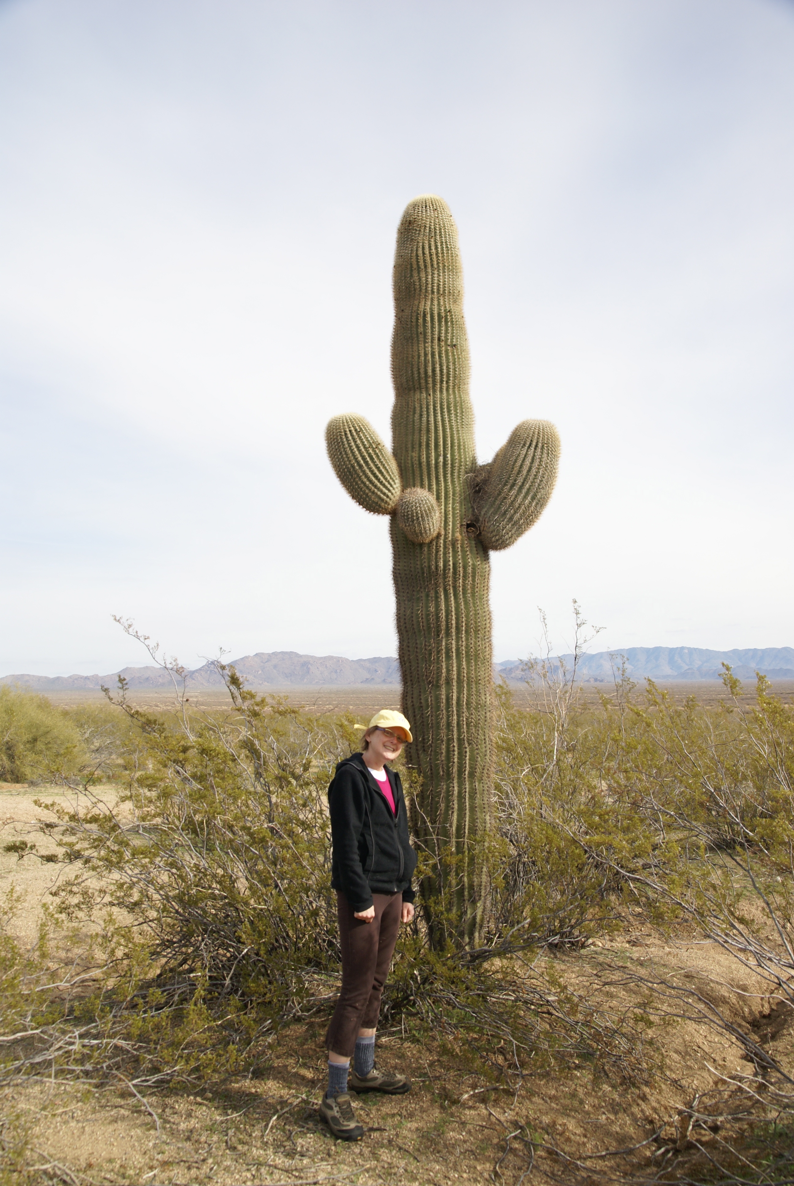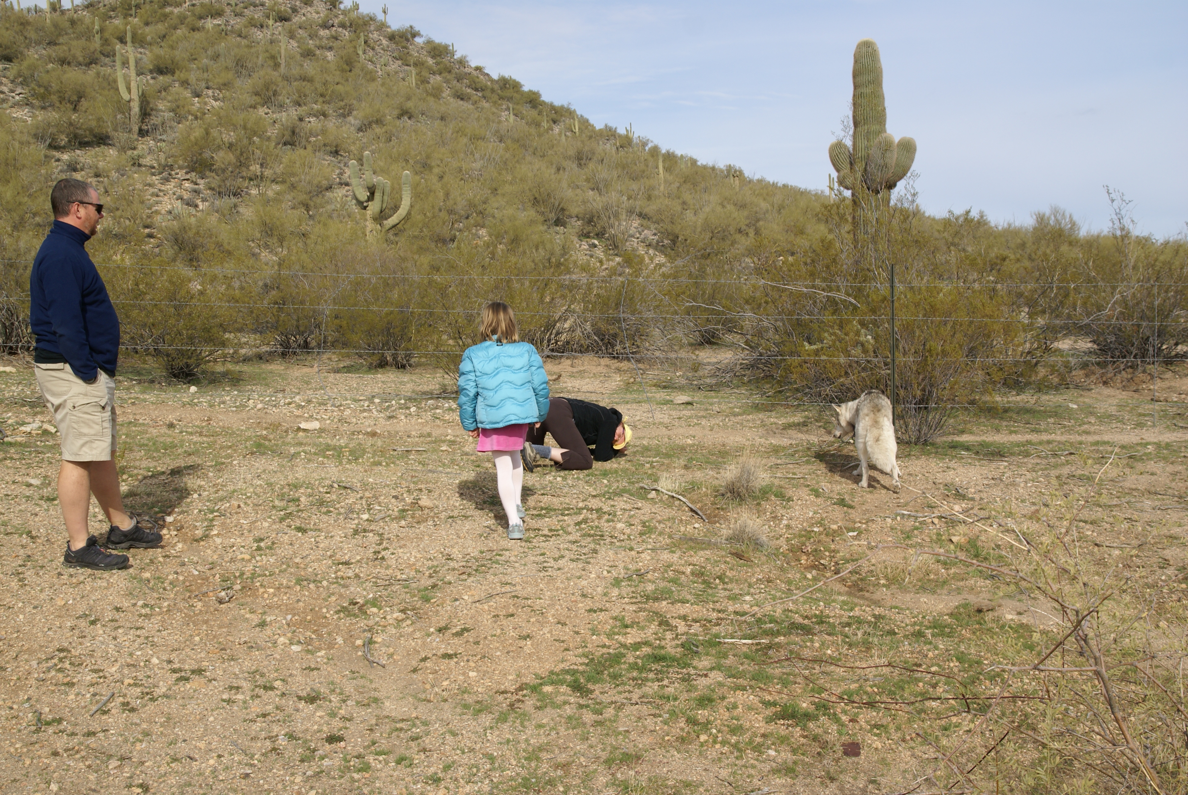 In the morning, we drove another very windy road. I got a bit car sick from riding in the back, and Louise switched places with me for a bit. We descended for a long time until we reached the flat, cactus-filled part of Arizona again. We showed Louise the saguaros, those cacti that we love, and we even climbed under a fence to get close to some.